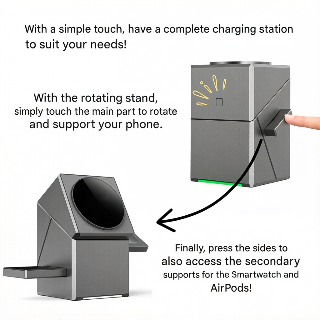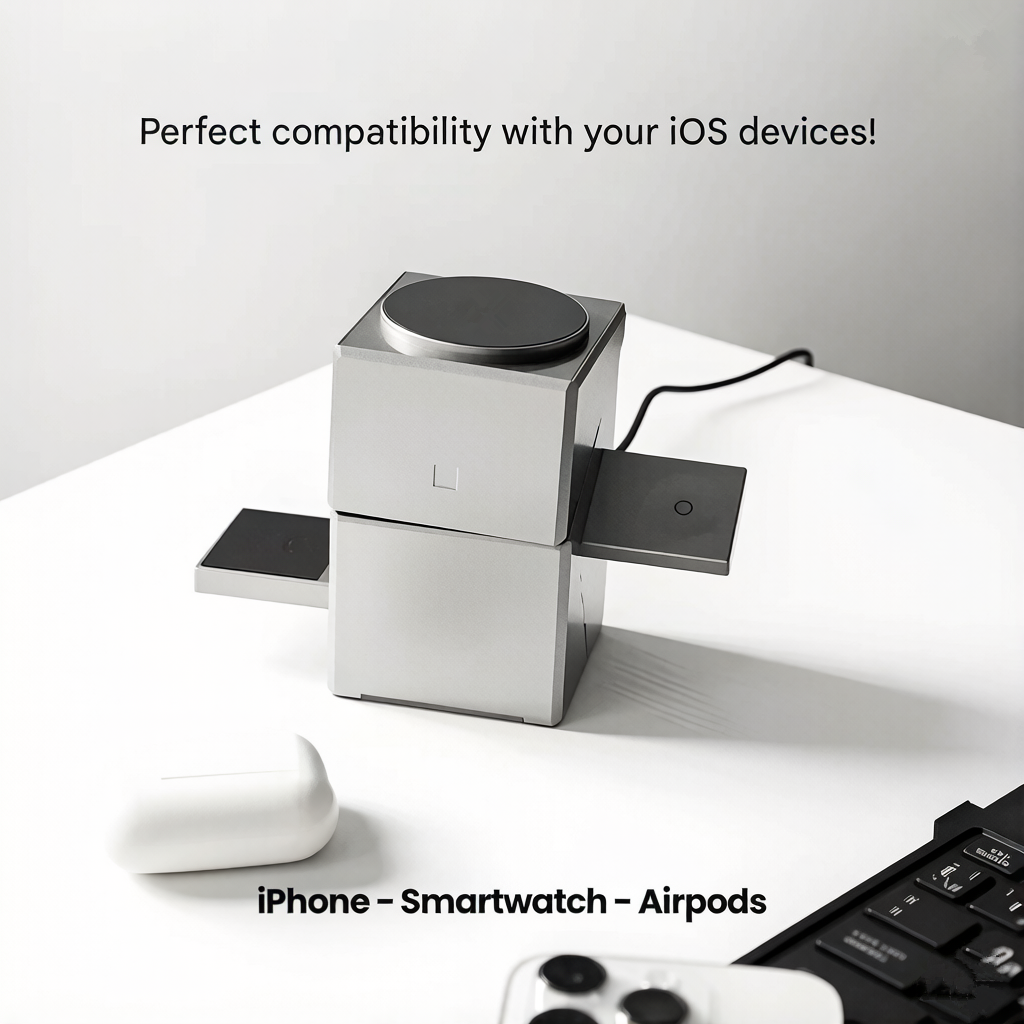 3-in-1 fast charging station for iPhone, Apple Watch, and AirPods, space-saving design.