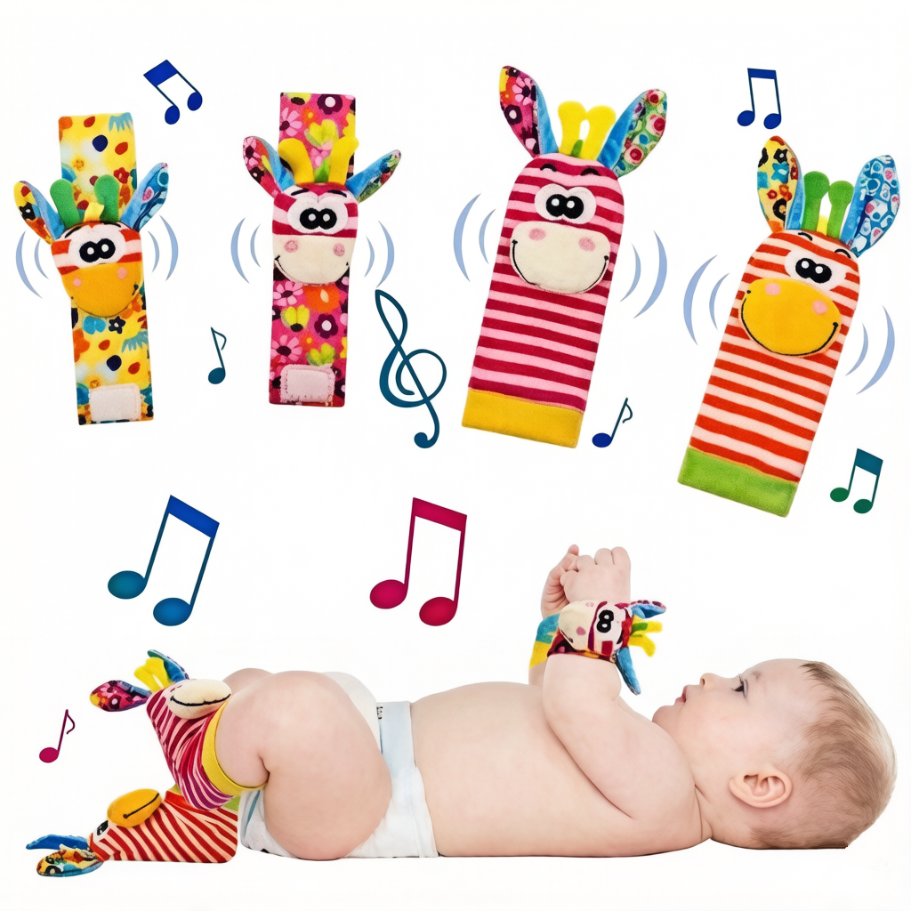 This 4-piece set of soft, safe wrist rattles and foot finders stimulates vision, hearing, and touch, promoting early brain development and body awareness for infants.