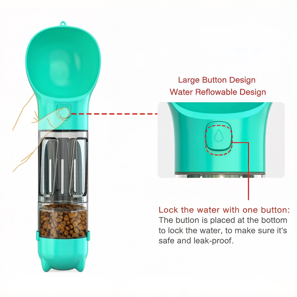A leakproof, 4-in-1 portable pet water bottle with water dispenser, food box, poop shovel, and trash bag storage, perfect for outdoor adventures.