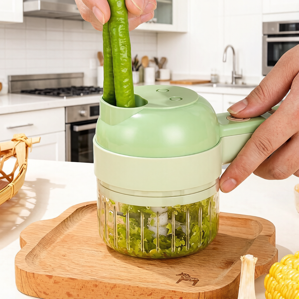 A versatile, wireless, and USB-rechargeable 5-in-1 electric chopper that simplifies food prep with one-touch operation and easy cleanup.
