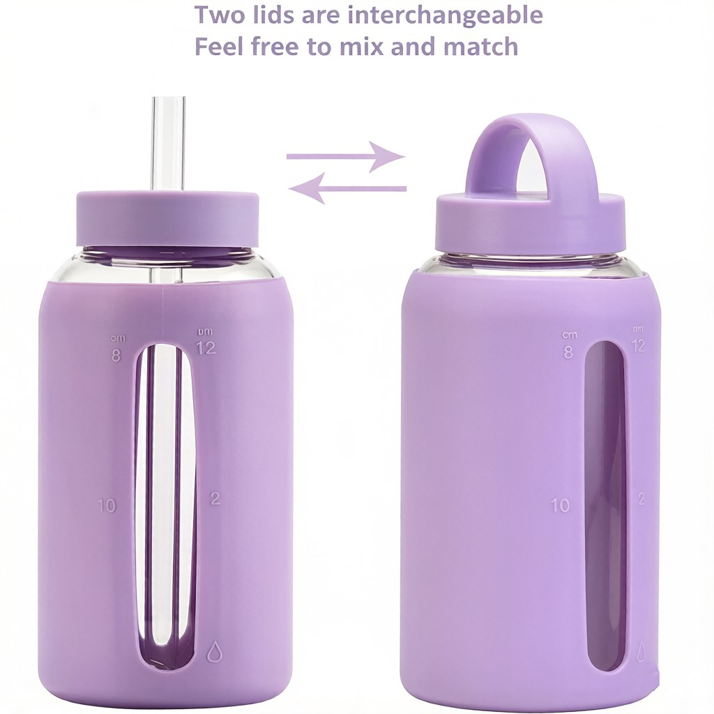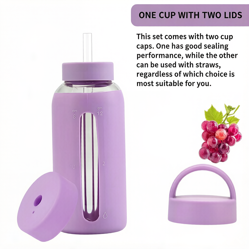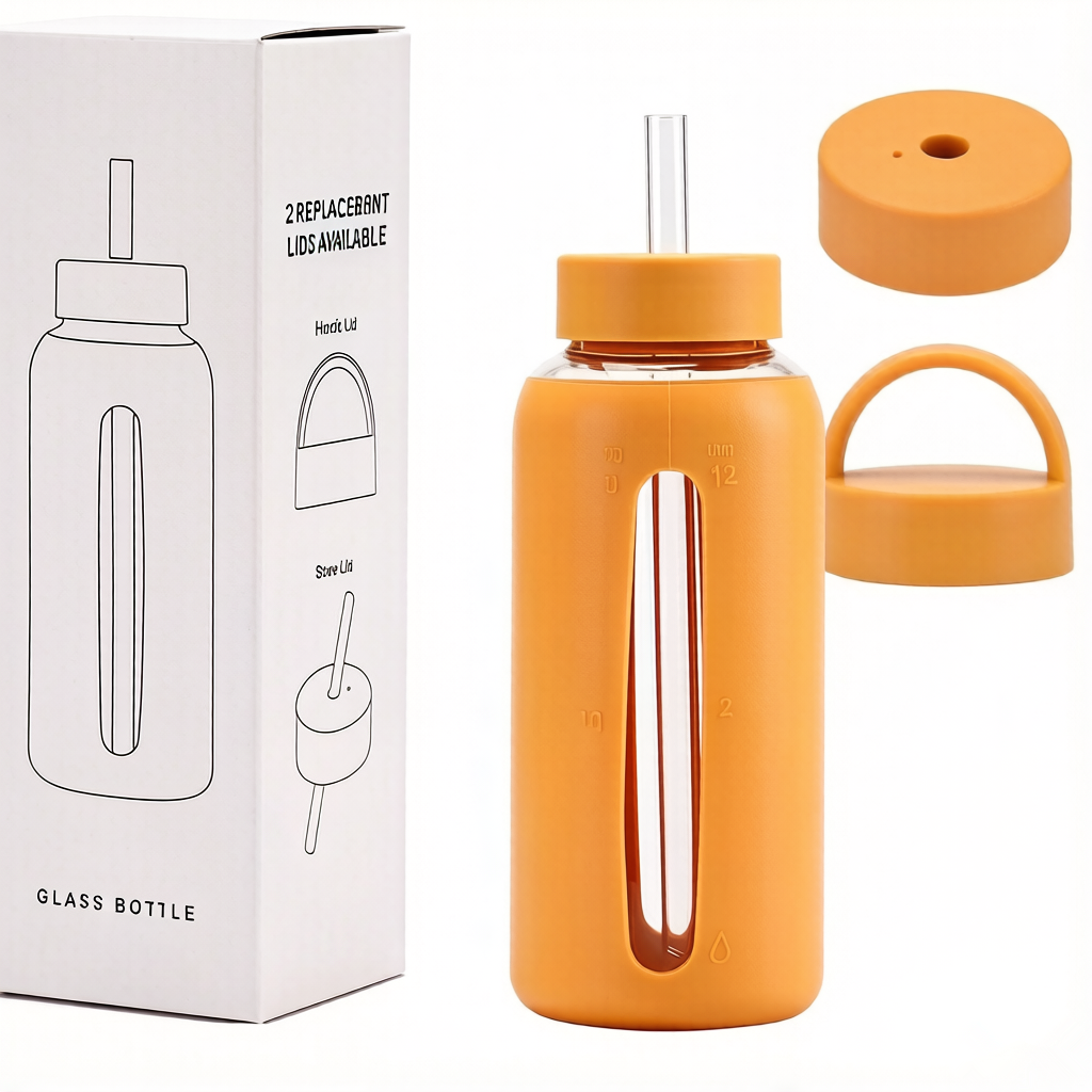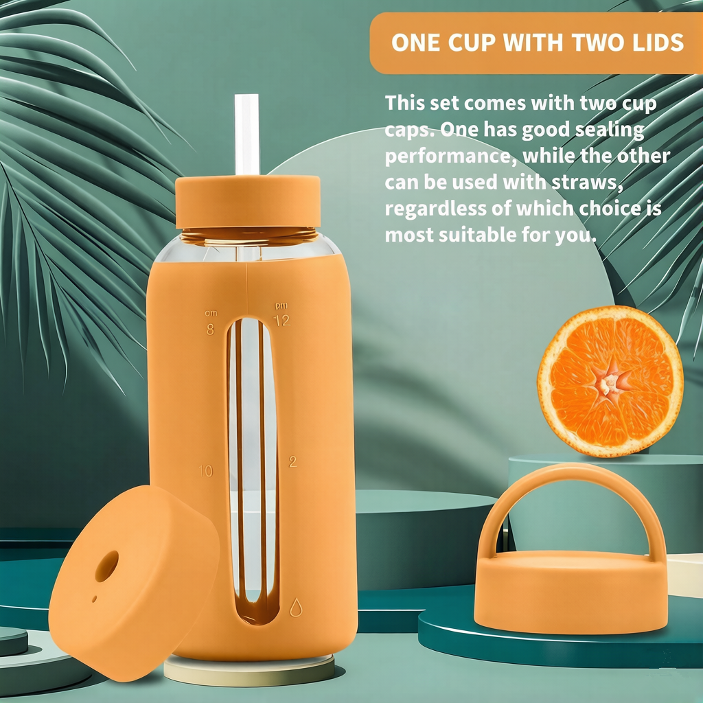 Durable, leak-proof, and reusable, this 27-ounce silicone glass water bottle features a protective silicone sleeve and dual lids for convenient hydration tracking and easy sipping.