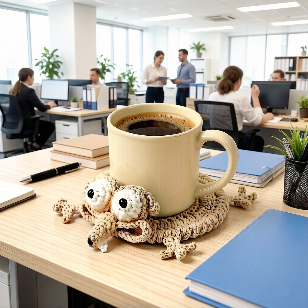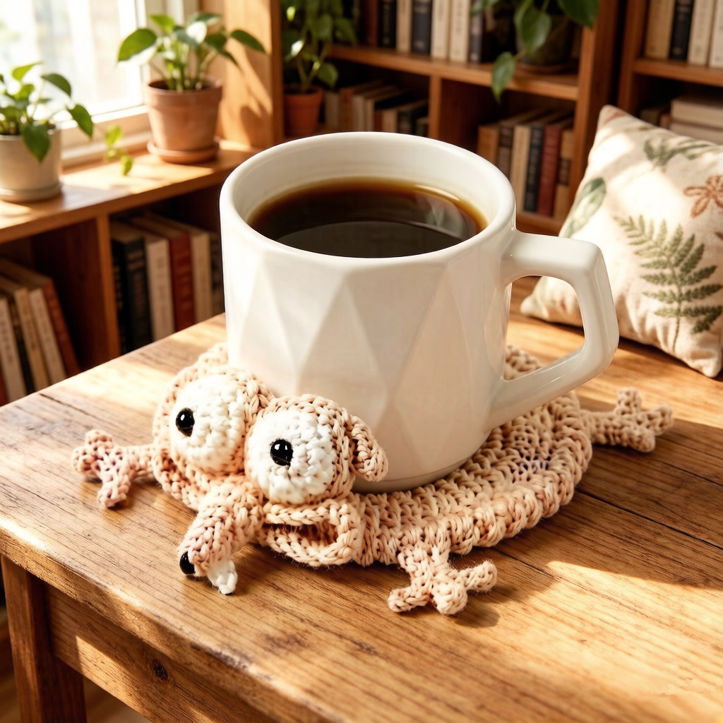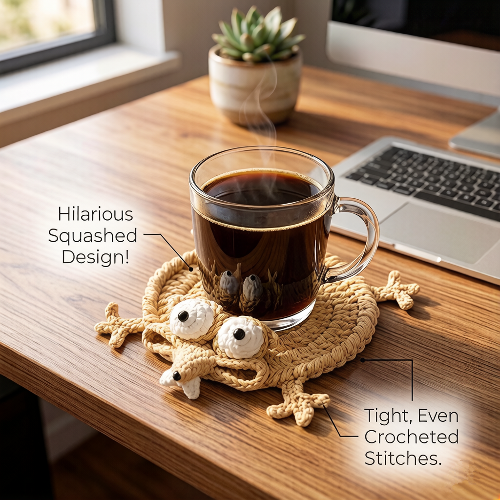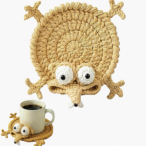 Handmade, durable crochet coasters with a humorous animal design that provide excellent table protection and serve as charming, playful home decor for any space.
